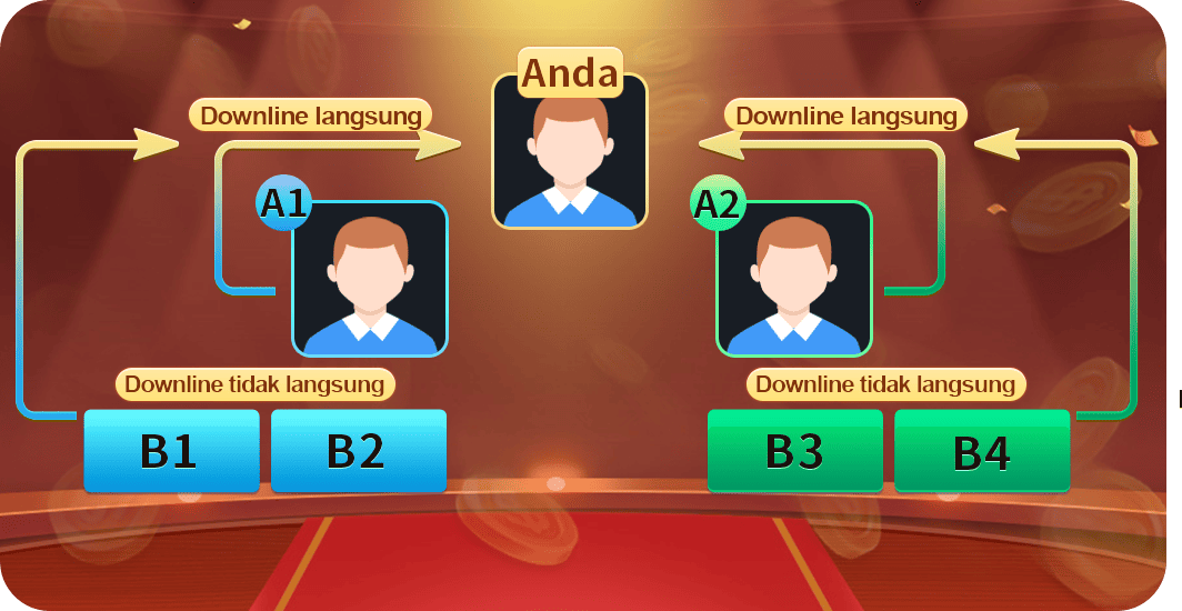 2. Taruhan dari bawahan tidak langsung Anda akan memberikan Anda selisih komisi tim. (Bawahan tidak langsung adalah anggota yang dikembangkan lebih lanjut oleh bawahan langsung Anda. Anggota yang direkrut oleh bawahan langsung Anda, serta anggota dari level berikutnya yang mereka kembangkan, semuanya termasuk bawahan tidak langsung Anda. Jumlah level bawahan tidak langsung tidak terbatas dan dapat berkembang tanpa batas.)